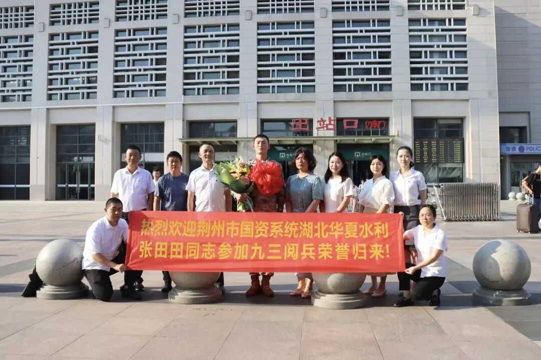 9月4日下午,張?zhí)锾锿据d譽(yù)歸來。荊州市退役軍人事務(wù)局副局長(zhǎng)李荊鳳,荊州市政府國(guó)資委黨委委員、副主任童克忠、黨委委員、副主任嚴(yán)珩,湖北華夏水利黨委書記、董事長(zhǎng)張澤武一行來到荊州火車站熱情迎接。